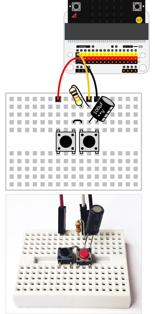 コンデンサと抵抗を下図のようにブレッドボードに組み立て、左側の充電スイッチを押すとコンデンサが充電され、コンデンサの端子電圧が測定されます。ジャンパ線はマイクロビットの1番ピンに接続されています。